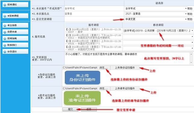 4) 填寫申請表時請寫清楚變更的原因,并上傳相應的證明文件;(身份證掃描件、準考證掃描件等)